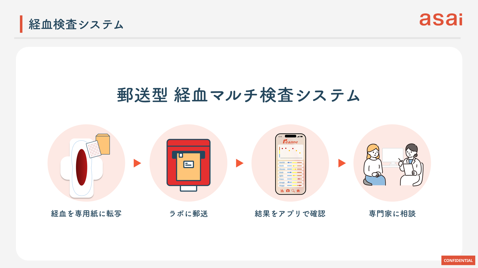 私たちは「研究開発型フェムテックスタートアップ」として、これまでになかった事業をゼロから立ち上げようとしています。基幹事業である「reanne(リアンネ)」プロジェクトでは、大学の研究機関とともに、経血成分の解析を進め、婦人科系疾患や月経トラブルをモニタリングする経血検査システム「reanne kit」の開発を行っています。