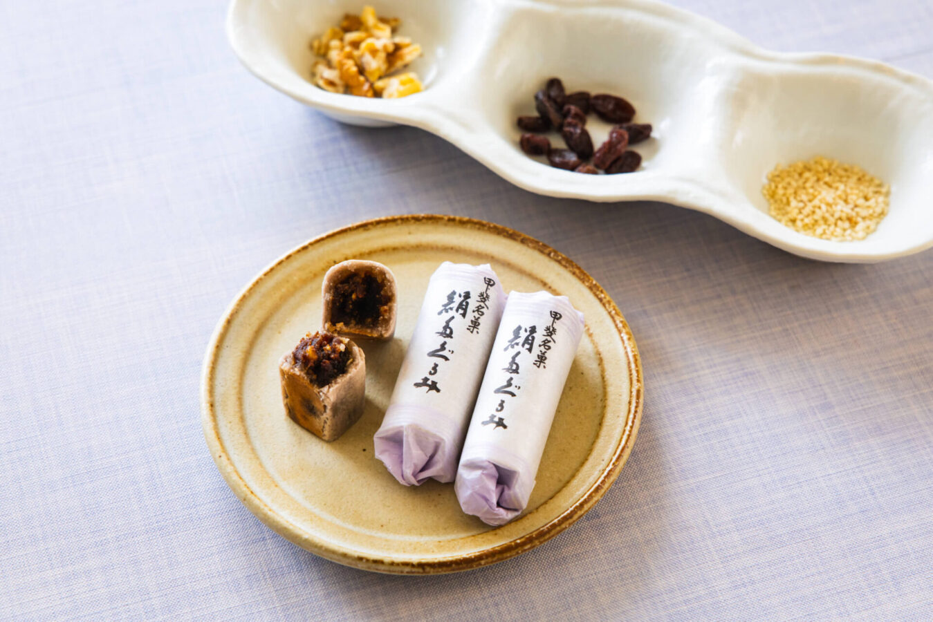 胡桃や干しぶどう、白ごまなどを練り込んだ黒糖風味の餡を桃山生地で包んで焼き上げた「絹多ぐるみ」。甲斐八珍果の素材から生まれた山梨らしい味わいの和菓子です。