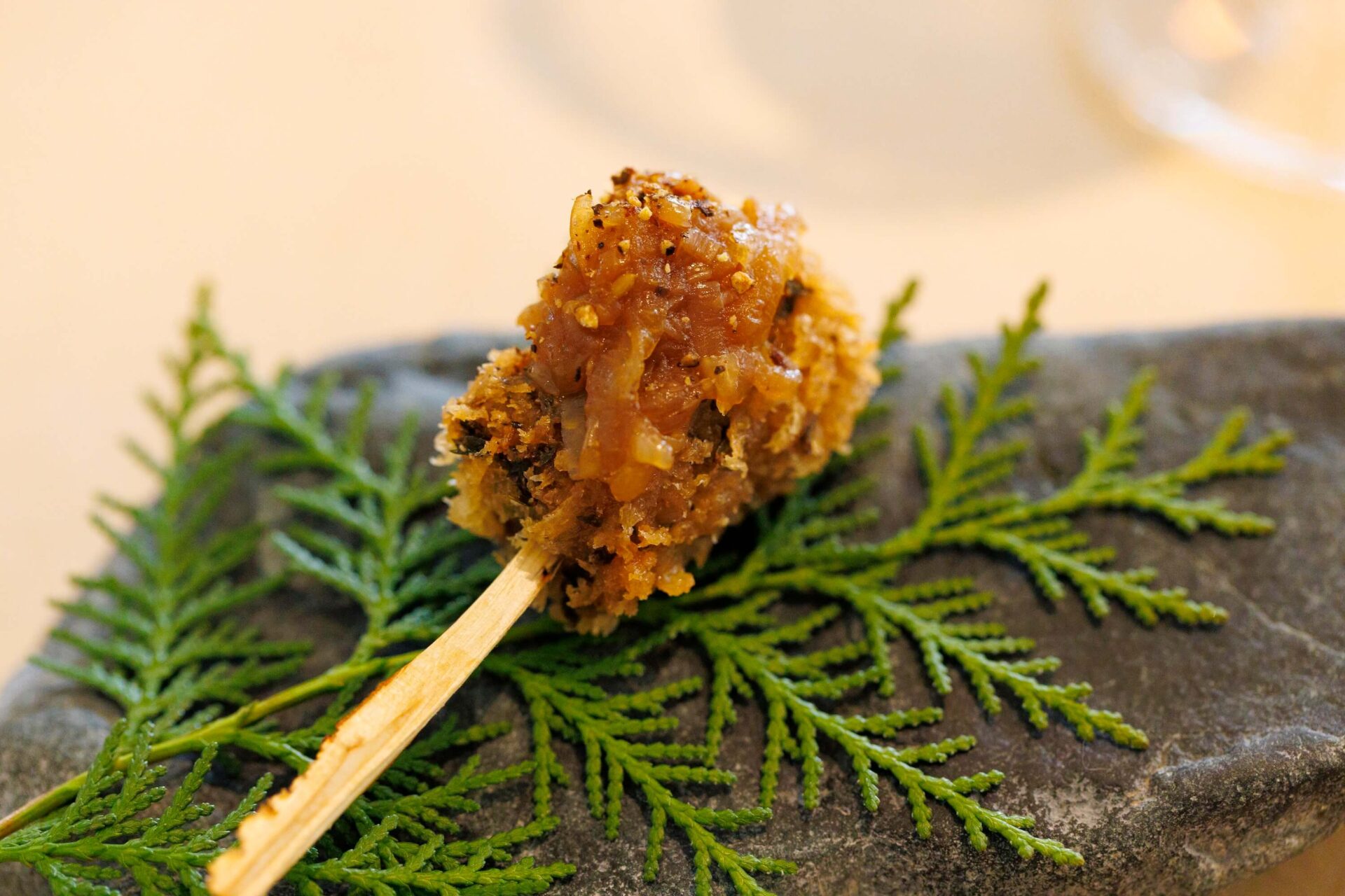 アミューズ(前菜)として出した山狸(やまだぬき)は、風味のクセが強い脂をすべて焼き切ってからビールとスパイスで煮込み、それを冷やして固めたものに、モミなどの針葉樹の葉を入れたパン粉をまぶして揚げました。タヌキが実際にいるエリアの自然をそのまま一皿に詰め込んで、まるで「森そのものを食べているような感覚」を味わえる料理に仕立てました。