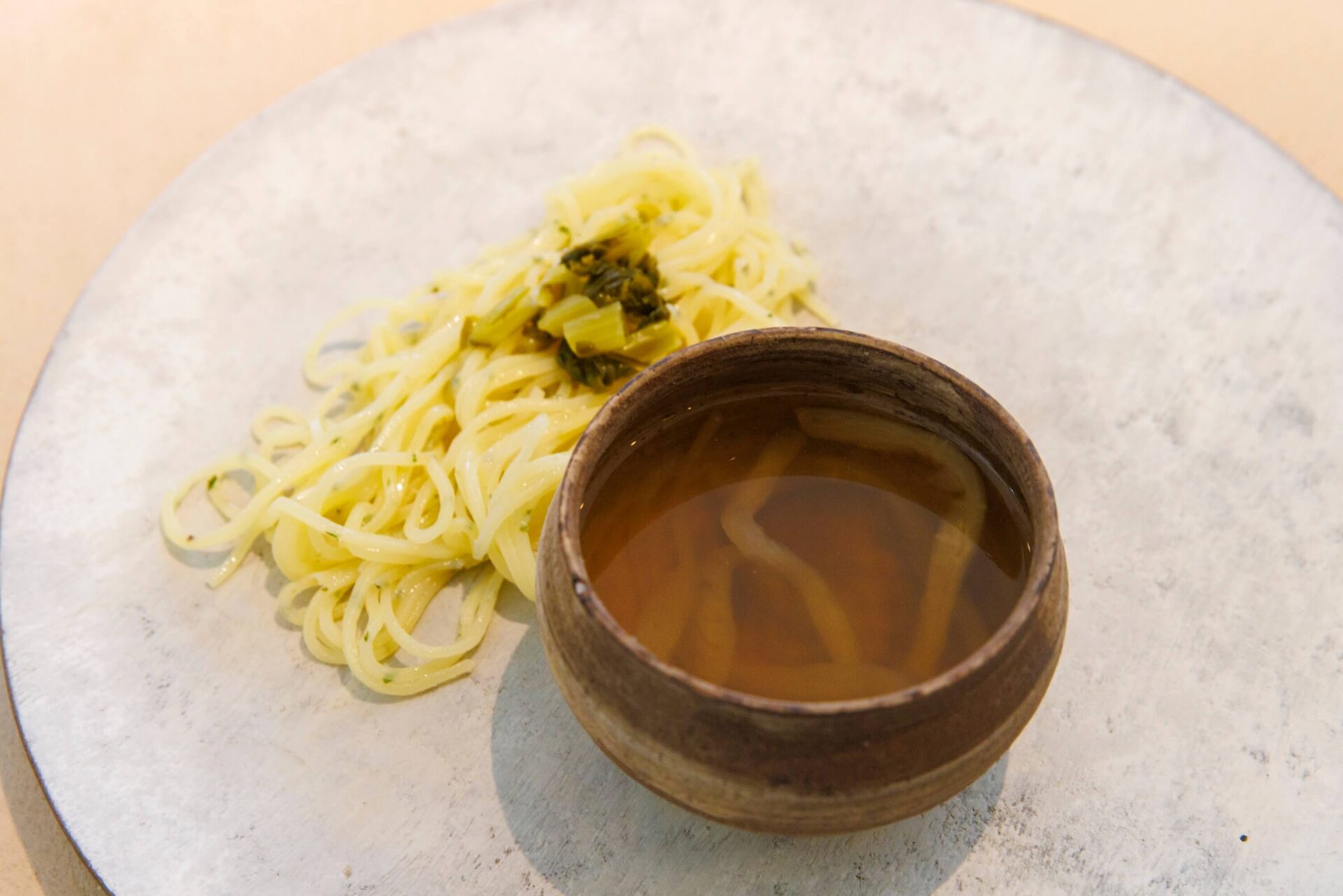 サワラ麺は、ヒノキ科の針葉樹・サワラ(椹)の葉の柔らかい部分を細かく刻んで、セモリナ粉と米粉を合わせた麺に練り込んだものです。サワラの香りがアクセントになって、食べると一気に森の中に入り込んだような心地になる一品です。スープは大根の汁と、近くで獲れた鮎を用いた自家製アユチョビ(鮎でつくったアンチョビ)のエキスを合わせて、甘く優しい味付けに仕上げました。