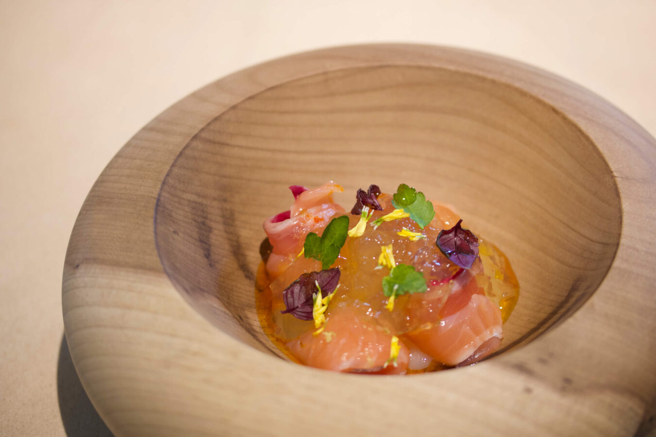 ここで使った食材のなかで特に印象的だったのは、富士の介(山梨県のブランド鱒)ですね。個人的には、山梨県を象徴する食材のひとつだと思っています。今回は県の方の協力のおかげで、県内で神経締めを施してくれる生産者に出会えて、とても高品質な魚を手に入れることができました。
