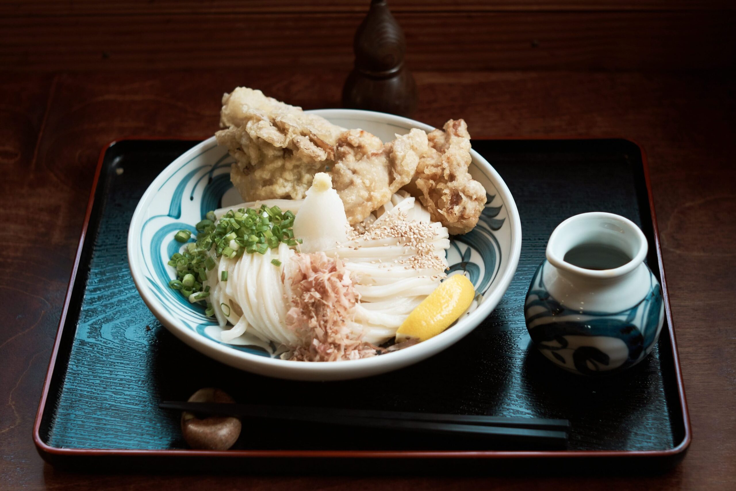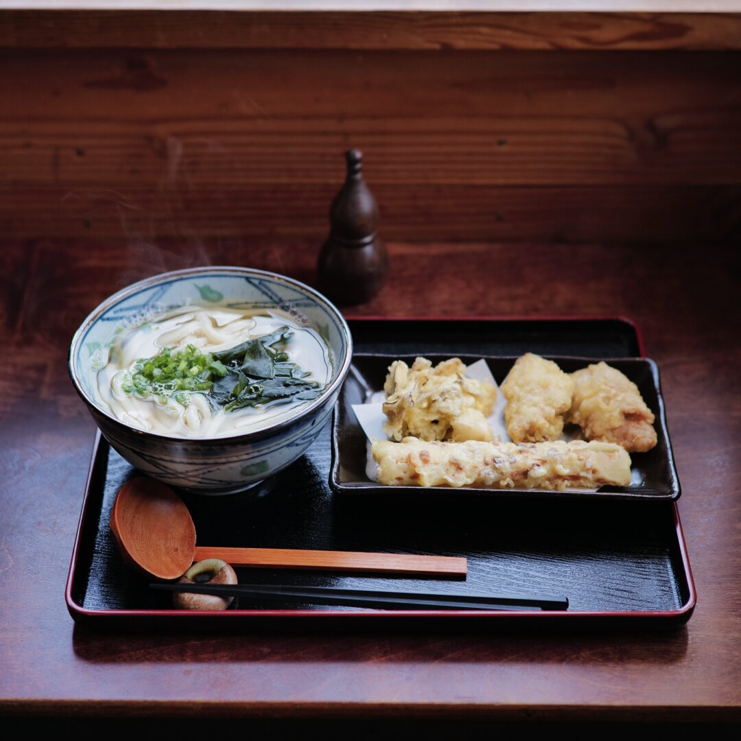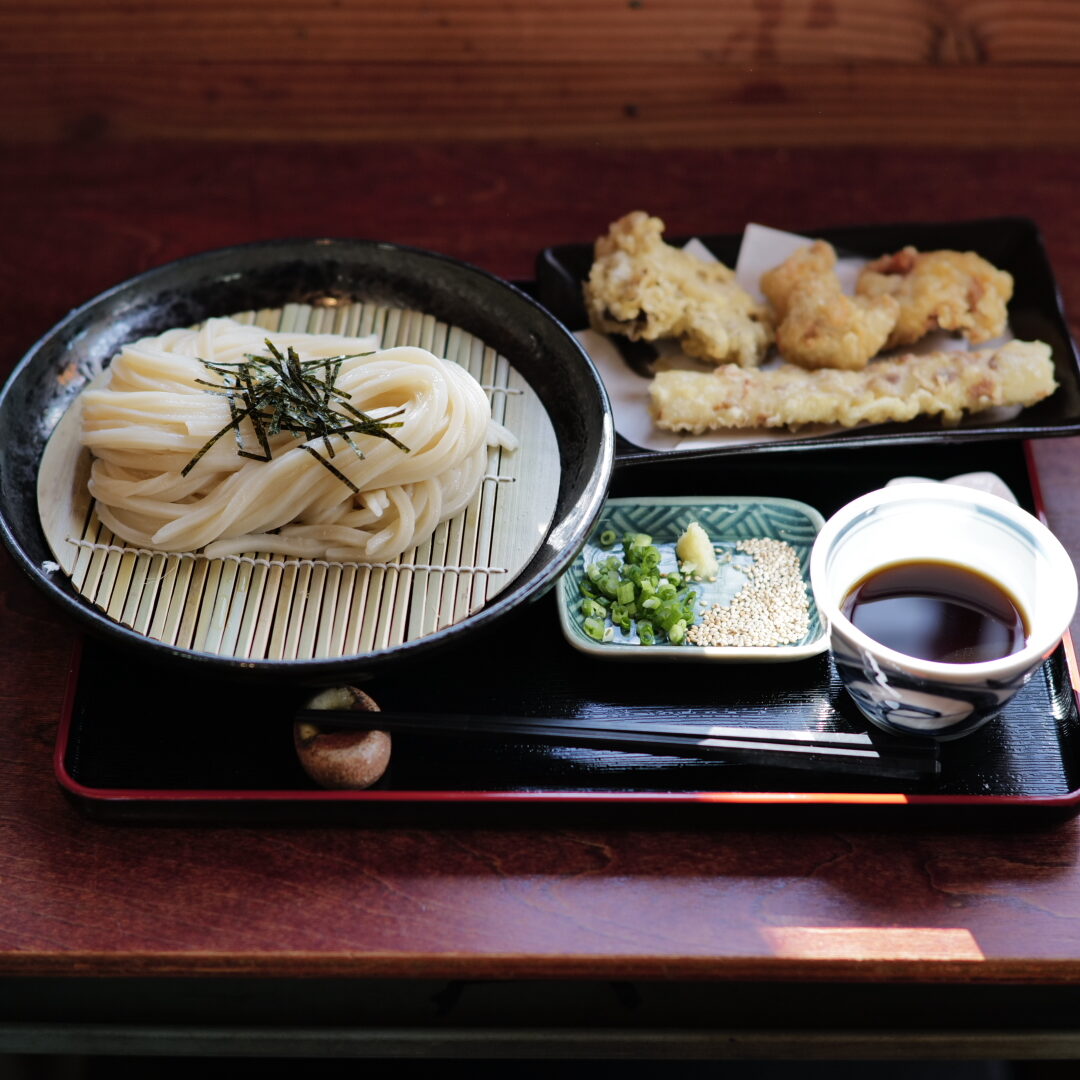 名物「讃岐天ぶっかけ」は、かしわ天とちくわ天、大きな舞茸天がのる。コシのある麺はゆで加減が絶妙。ほかに、黄金色に透き通ったクリアなつゆが魅力の温かい「かけうどん」もおすすめ。