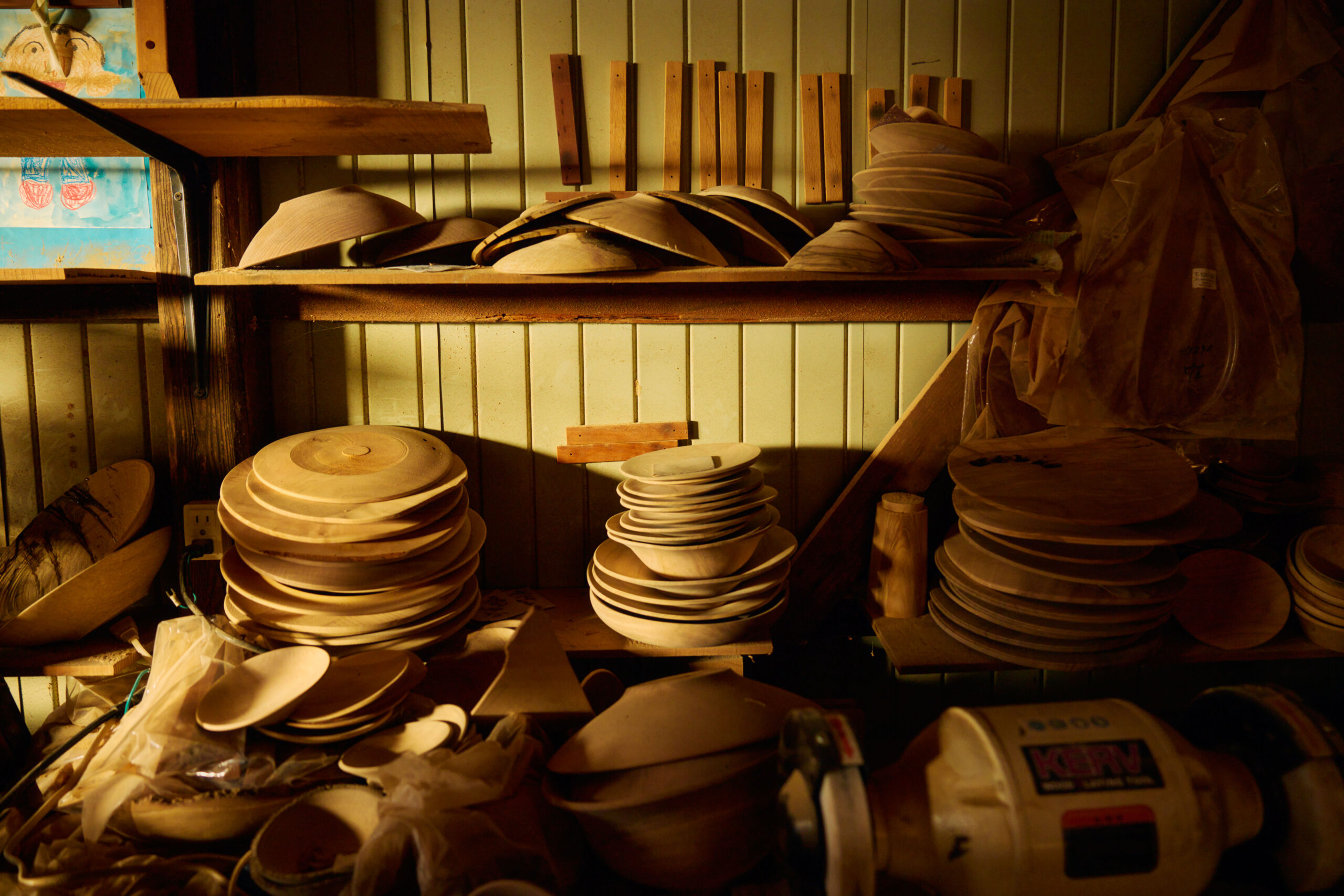 宮川さんの工房は、自然豊かな身延町の古い平屋に構えられている。木漏れ日が差し込む工房で、宮川さんはろくろを回しながら、ひとつひとつ丁寧に器を作り上げていく。「手に入った木材によって作る形を決めていくんです。大きいものはなるべく大きく作る。小さい木で大きいものは作れませんから」。木の個性を見極め、その木が持つ可能性を最大限に引き出す。それが宮川さんの制作スタイルだ。地元の木を使った食器やランプシェードを中心に、野趣あふれるナチュラルエッジのボウルや、アンティーク感のあるリム皿を得意とする。「外国の木を使わなくても、こっちの木で十分に作れる。使えない木はほぼないですね」。かつて家の柱にしか使えないと思われていた木も、作り方や使い方次第で美しい器に生まれ変わる。木工の知識は、ほぼ独学で身につけた。「最初は何も考えずに作っていたんですけど、だんだん器の形になっていって」。生木を用いて乾燥の過程で割れないよう均一の厚さにする技術も、試行錯誤の中で習得していったそうだ。
