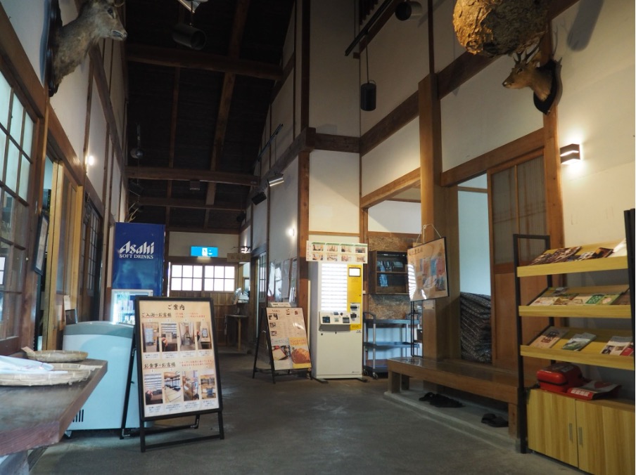 館内には食事処もあり、ほうとうやワラビそば、ヤマメフライなど、土地の味が楽しめる品など豊富なメニューがそろっています。入り口のお土産コーナーで、並んでいる特産品や手仕事の品などを選ぶのも楽しい時間です。