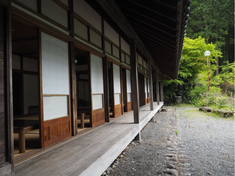 女帝の湯の館内には、無料で使える座敷の休憩スペースがあり、お風呂上がりはここでひと休みするのがおすすめです。部屋は縁側と続いていて、山の稜線や奈良田湖の景色も一望できます。
