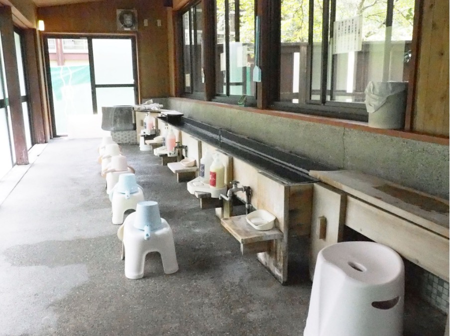 洗い場は少し変わっていて、温泉の源泉が絶えず流れている水場があり、そこから洗面器でお湯をすくって身体を洗うスタイル。湯船も、山の景色に自然と溶け込むような佇まいになっていて趣向が凝らされています。