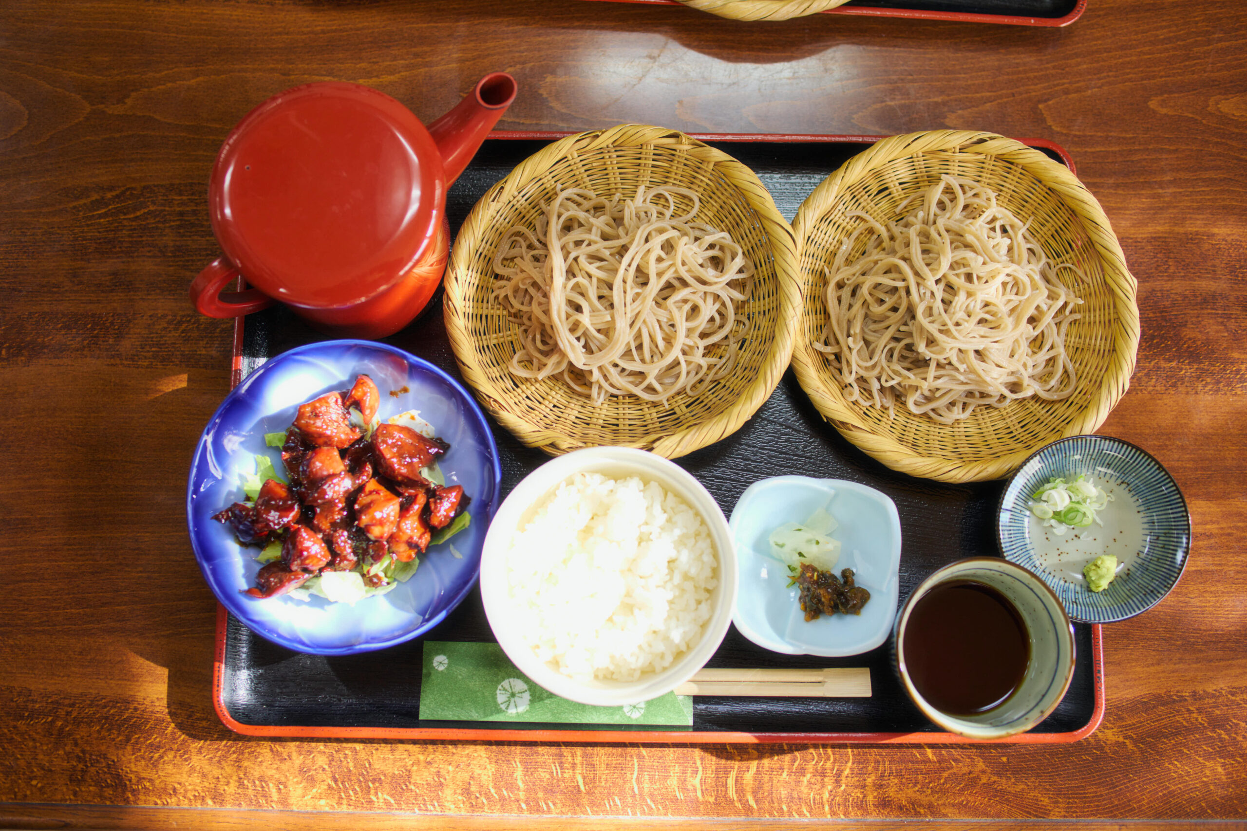 鳥もつ煮そばセット。週末の日中限定で営業している食堂で食べることができる。