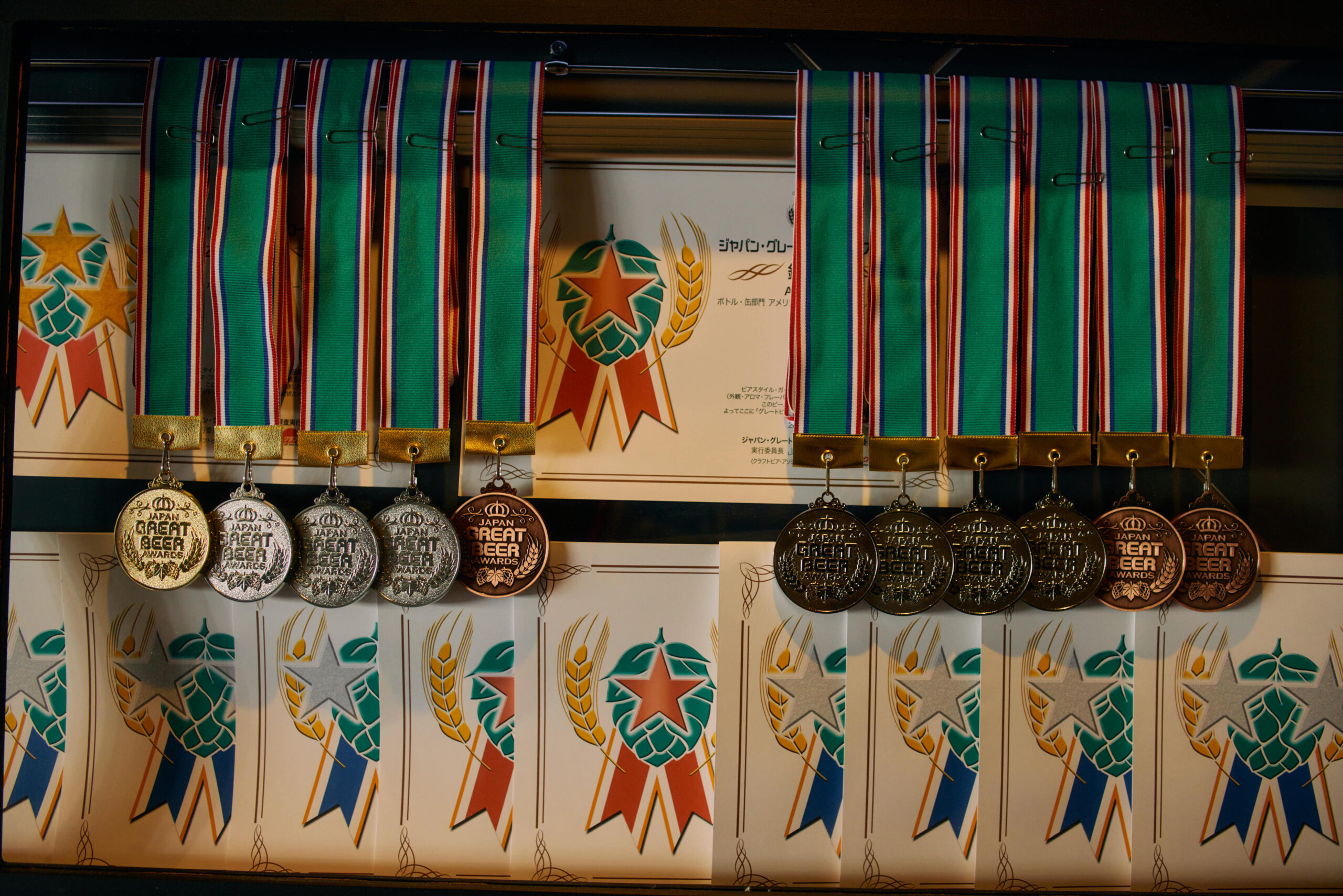 国内外の審査会やコンテストで受賞した時の賞状やメダルがずらりと並ぶ。