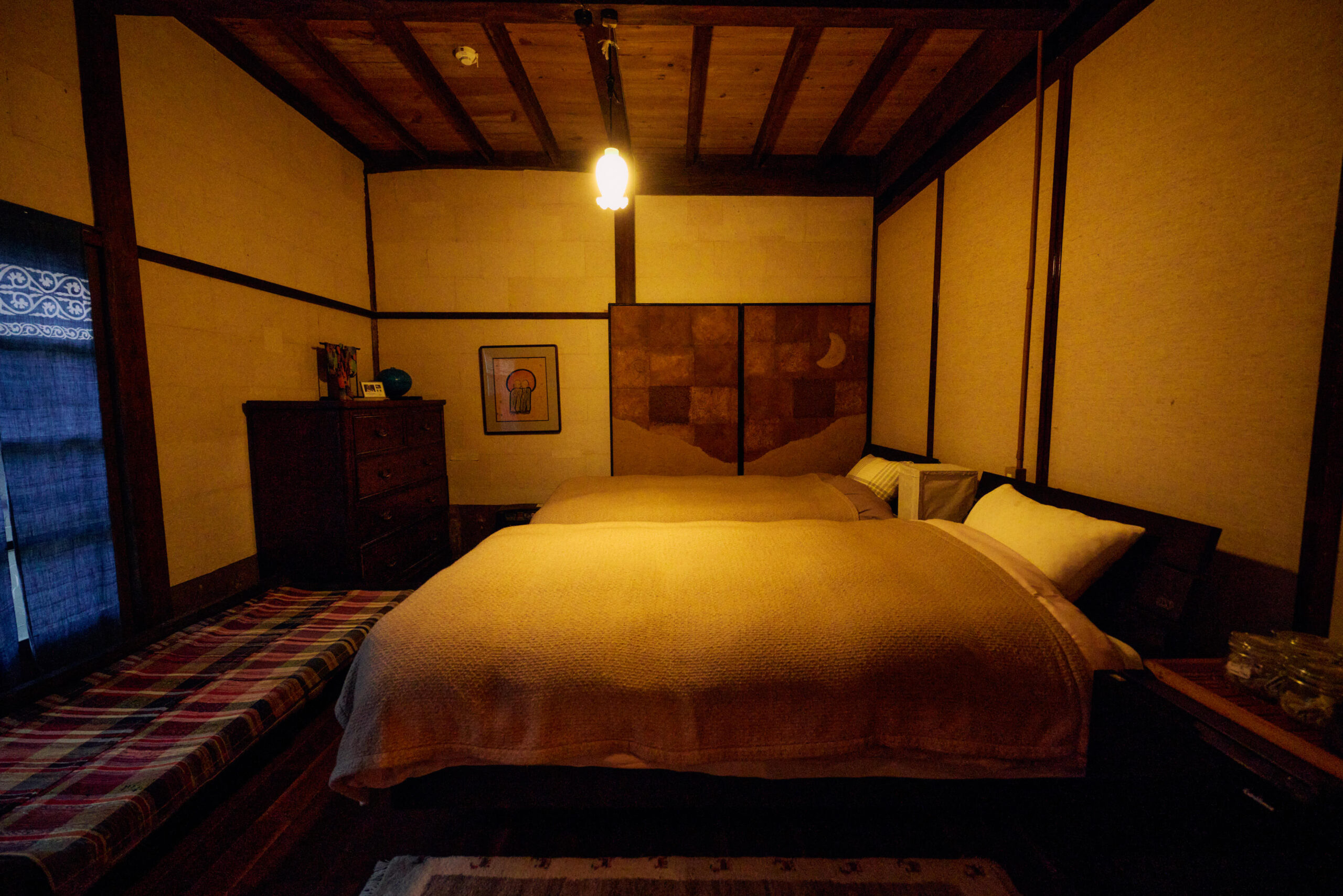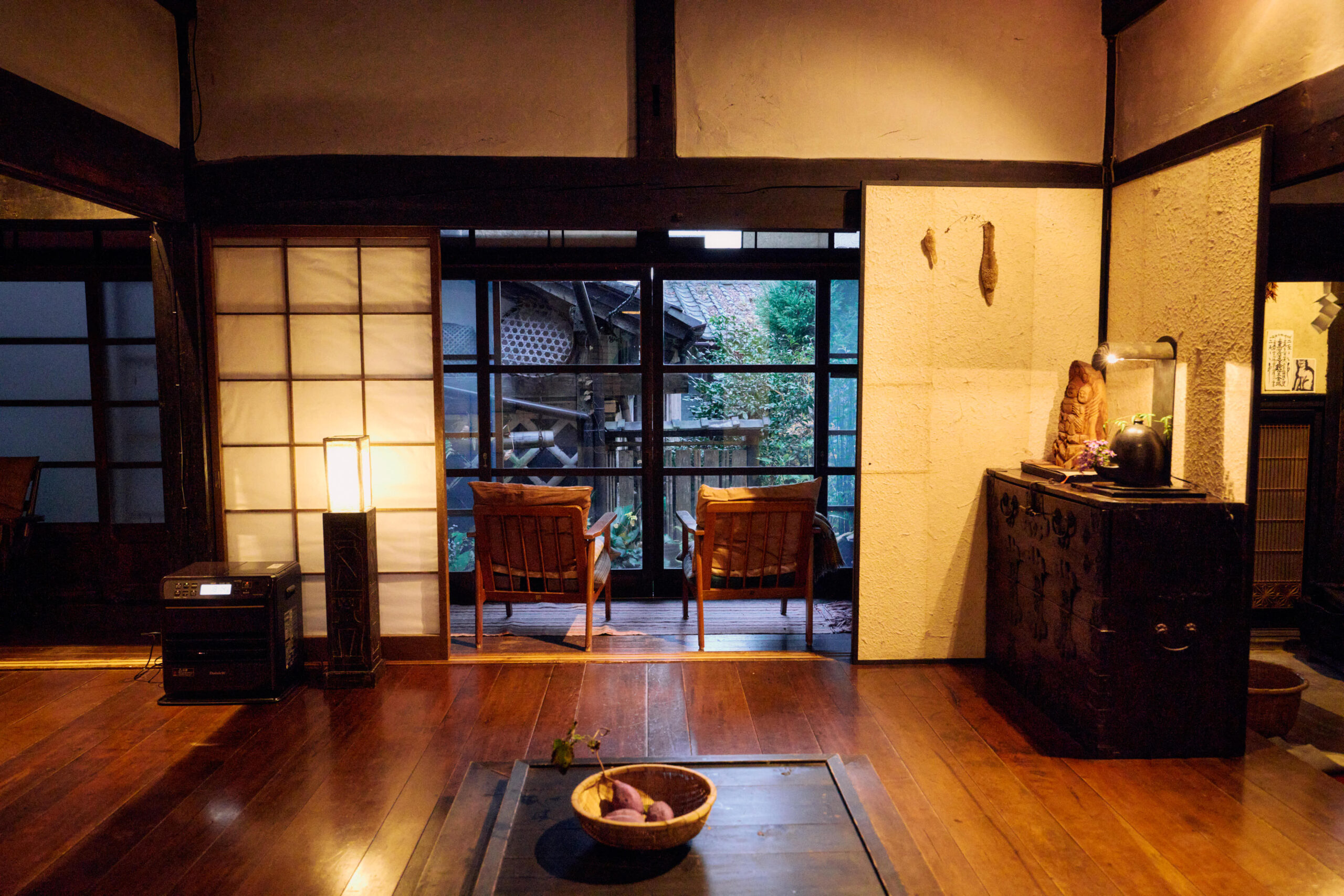 築185年の建物は、もともと養蚕業を営むための場所だったそう。入り口の扉を開けて中へ入ると、そこに広がるのはなんだか懐かしさを感じる空間。今では目にする機会が減ってしまった囲炉裏や鳥や風の声が聞こえる縁側のせいだろうか。部屋のあちらこちらには、勇子さんが集めたというアジアのアンティーク家具や雑貨も。一見するとユニークなこれらのアイテムも、空間に自然と溶け込み、実家に帰ったかのような心地よさを生み出している。奥には最大8名がゆったり寝られる広々としたベッドルームがあり、家族や友人と訪れても気兼ねなくくつろげそうだ。