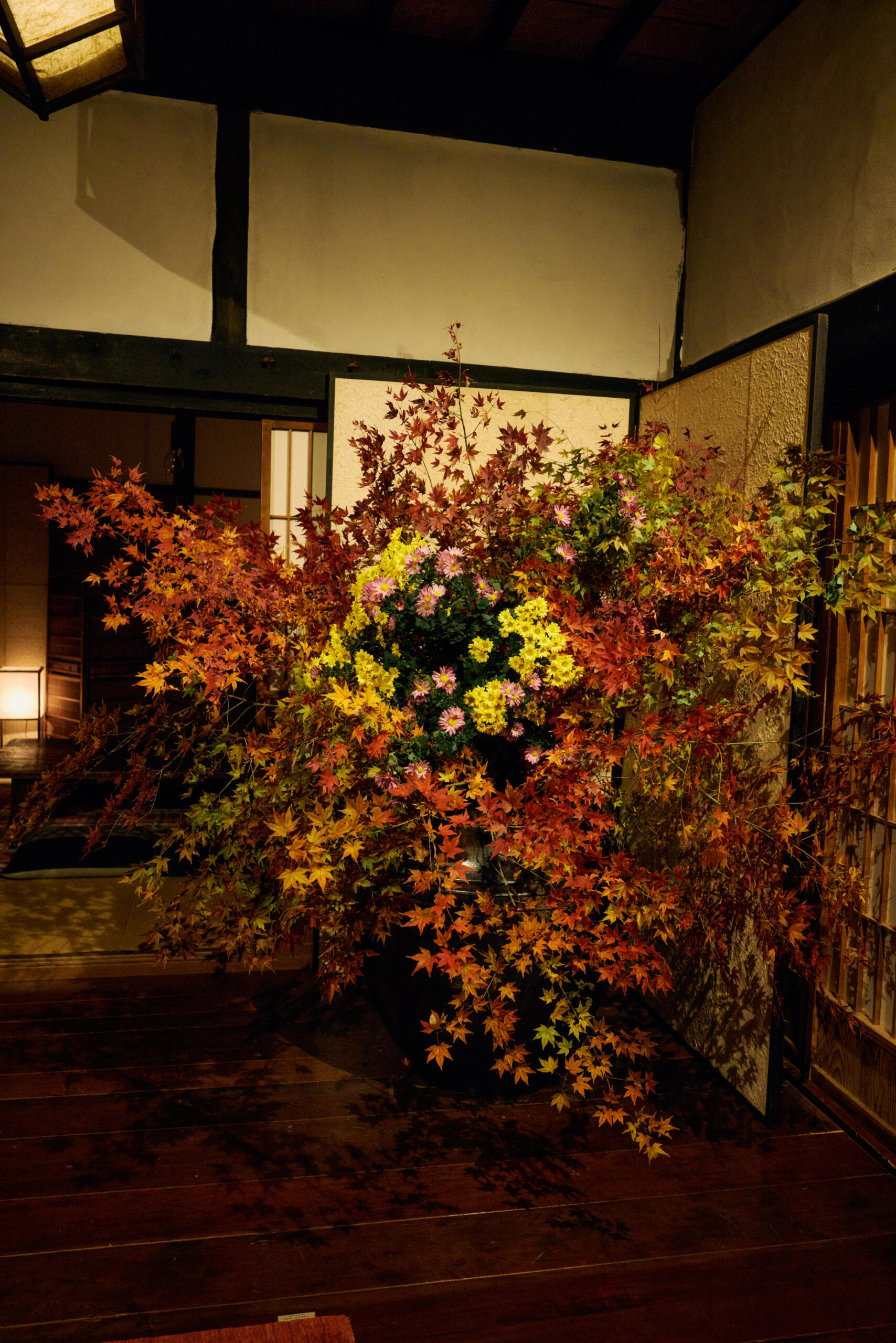市川三郷の山奥にひっそりと佇む「ちかはぎ空の家」。玄関に優しく灯されたあかりが出迎えてくれる。