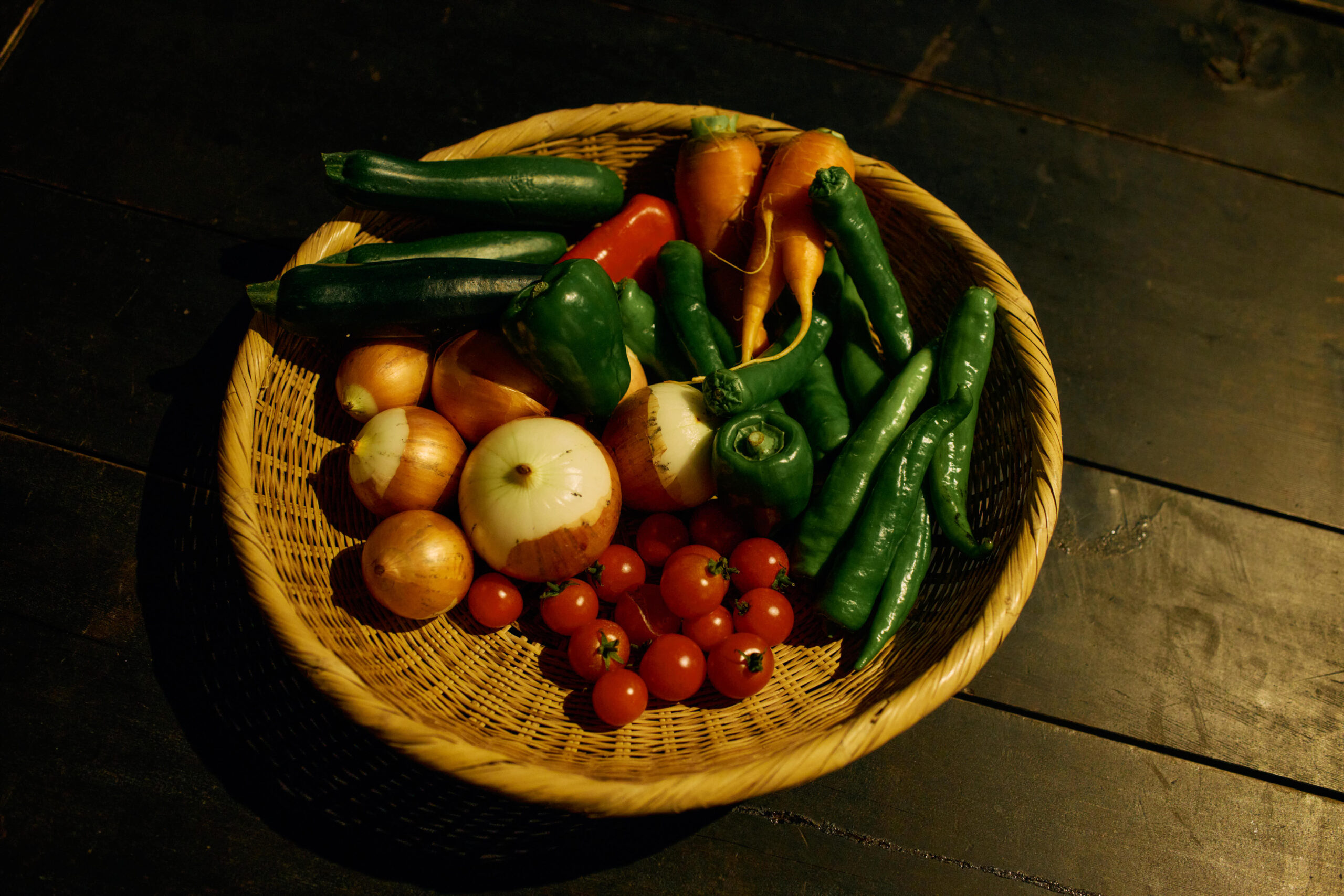 地元で採れた色とりどりの野菜。時には日光に当てたり、甘さが増すように工夫して食卓へ並べる。