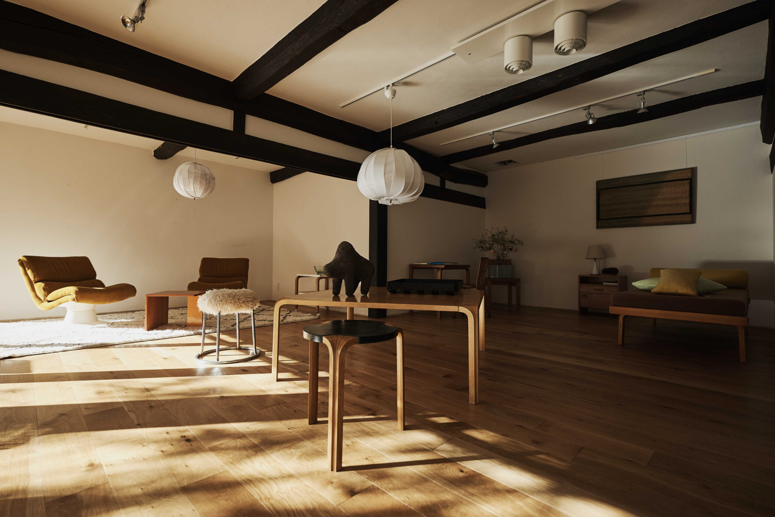 南部町の山間に、古民家をリノベーションしたギャラリー「SNORK」はある。ここは、モダニズム期のフィンランドを中心としたヴィンテージ家具やプロダクトを取り扱うセレクトショップ。古民家をセルフリノベーションしたギャラリーには、アルヴァ・アアルト、イルマリ・タピオヴァーラといったフィンランドデザイナーの家具が、それらの家具がある暮らしを想起させる形で美しくレイアウトされている。