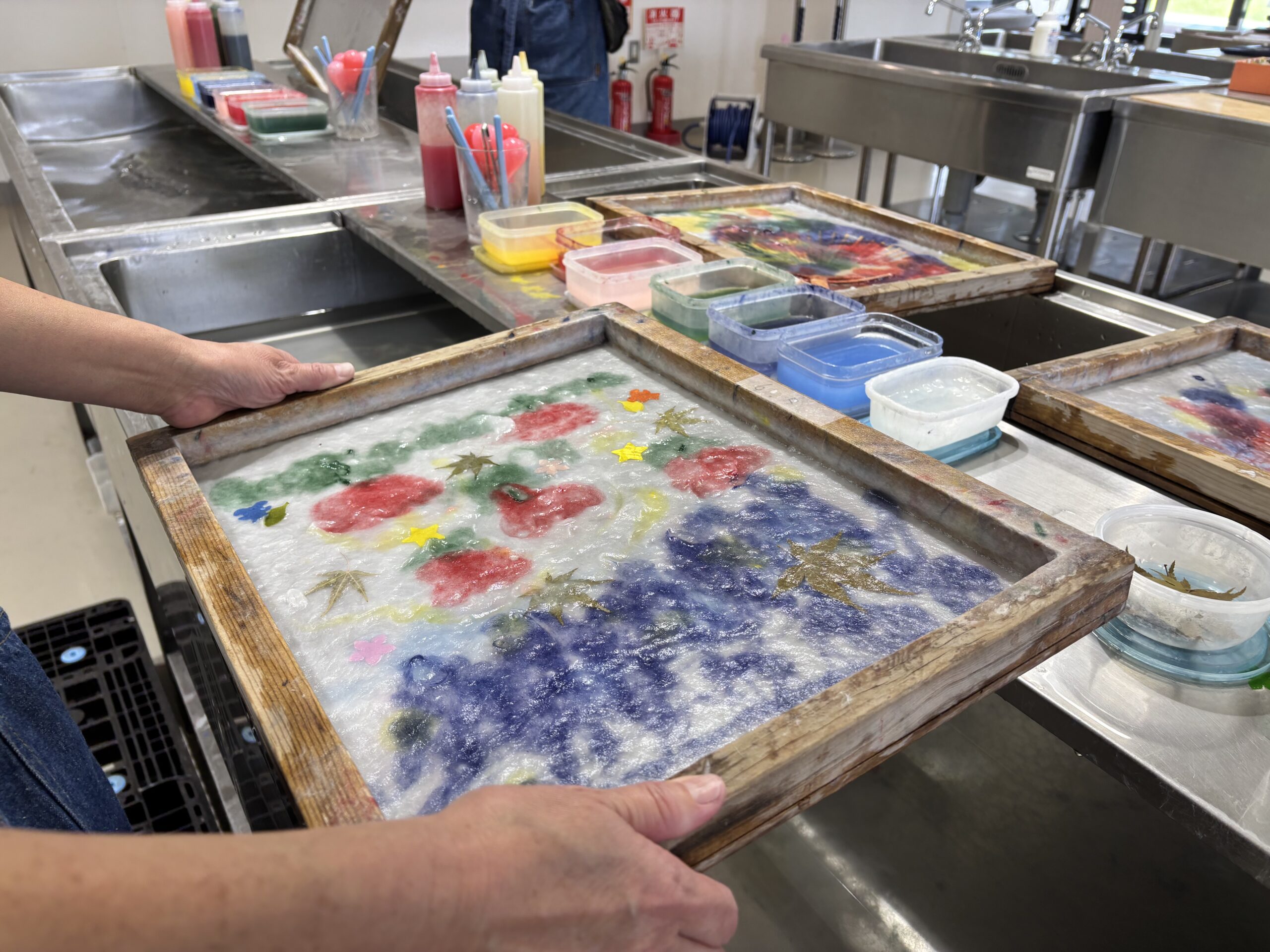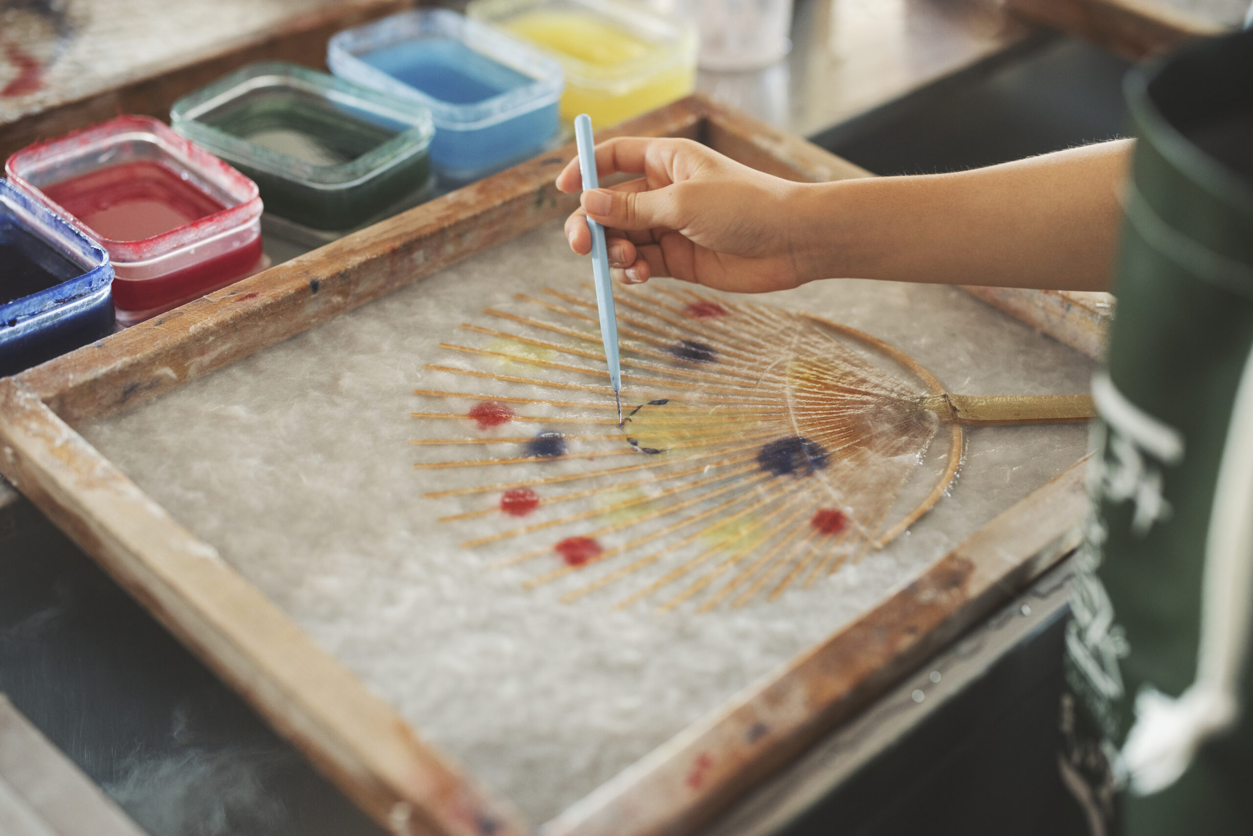 体験内容は「字浮き」「うちわ漉き」「タペストリー漉き」「灯り漉き」など多彩で、季節に合わせた特別な体験メニューもご用意しています。紙の温もりと、手仕事の奥深さを感じられる貴重な体験として、多くの方に好評をいただいています。