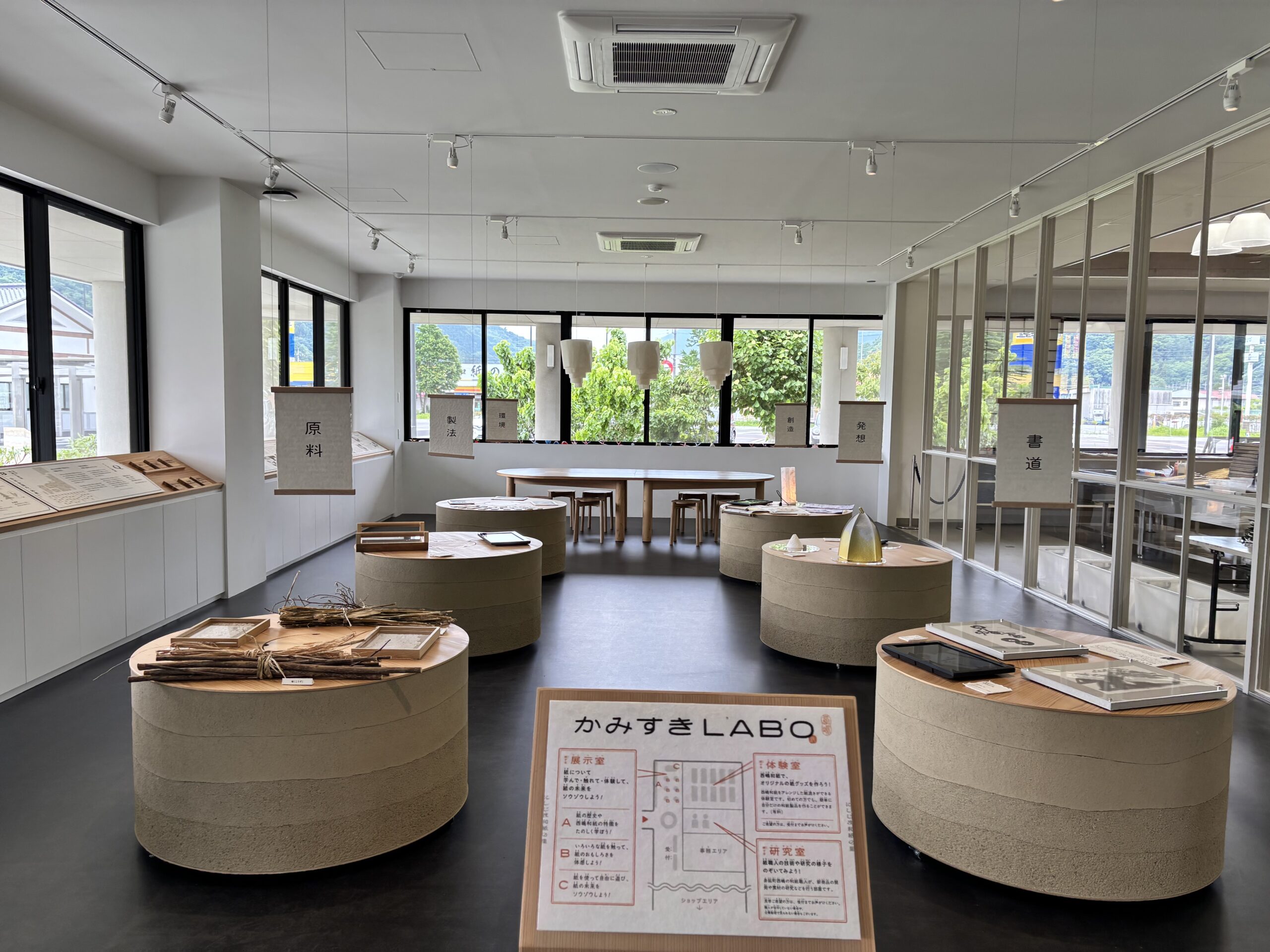 まず、「か」のマークが目印のかみすき館では、和紙づくり体験や書道体験ができるほか、西嶋和紙製品の販売も行っています。伝統と文化に触れながら、ものづくりの楽しさを体験できる人気のエリアです。