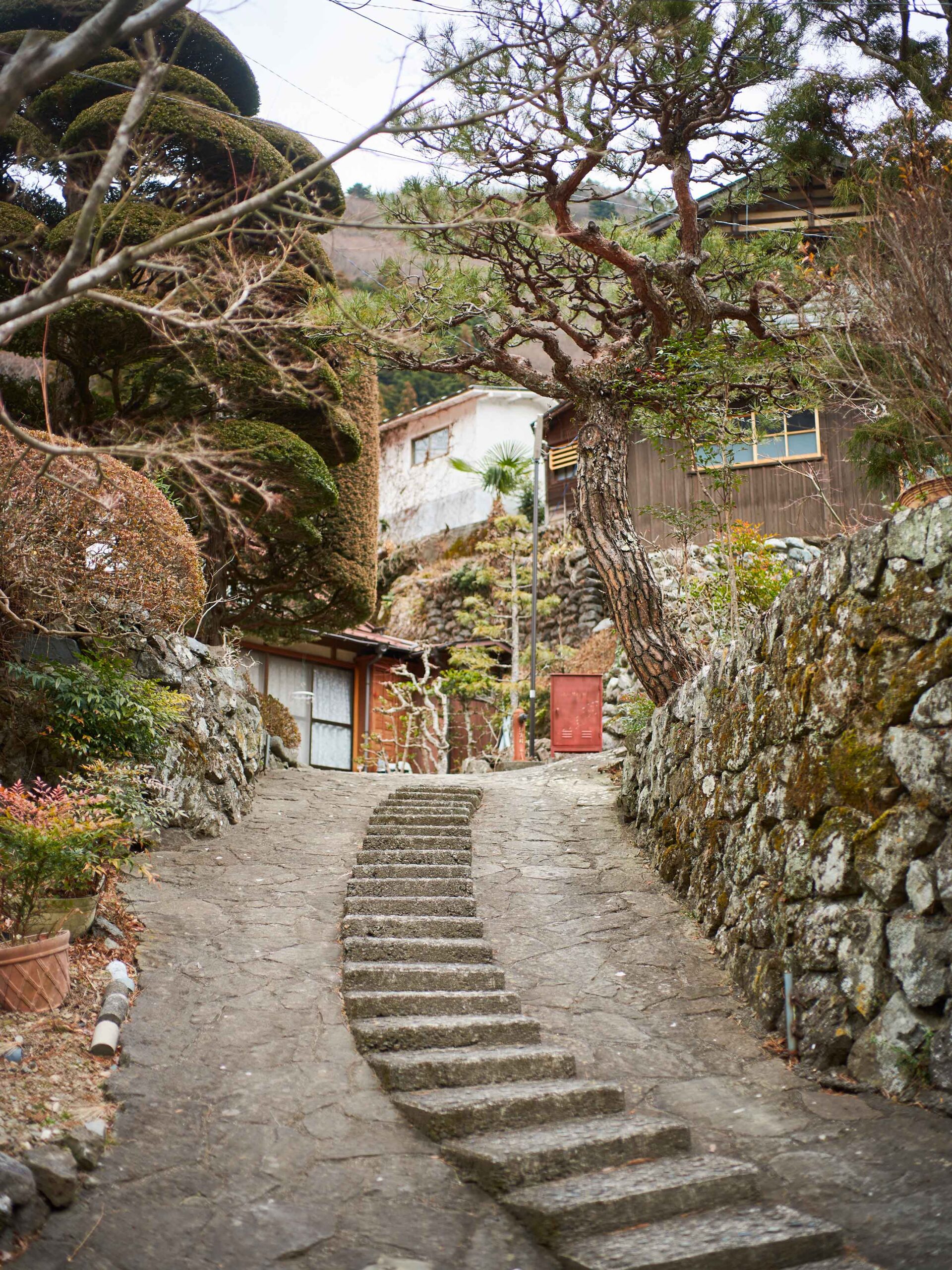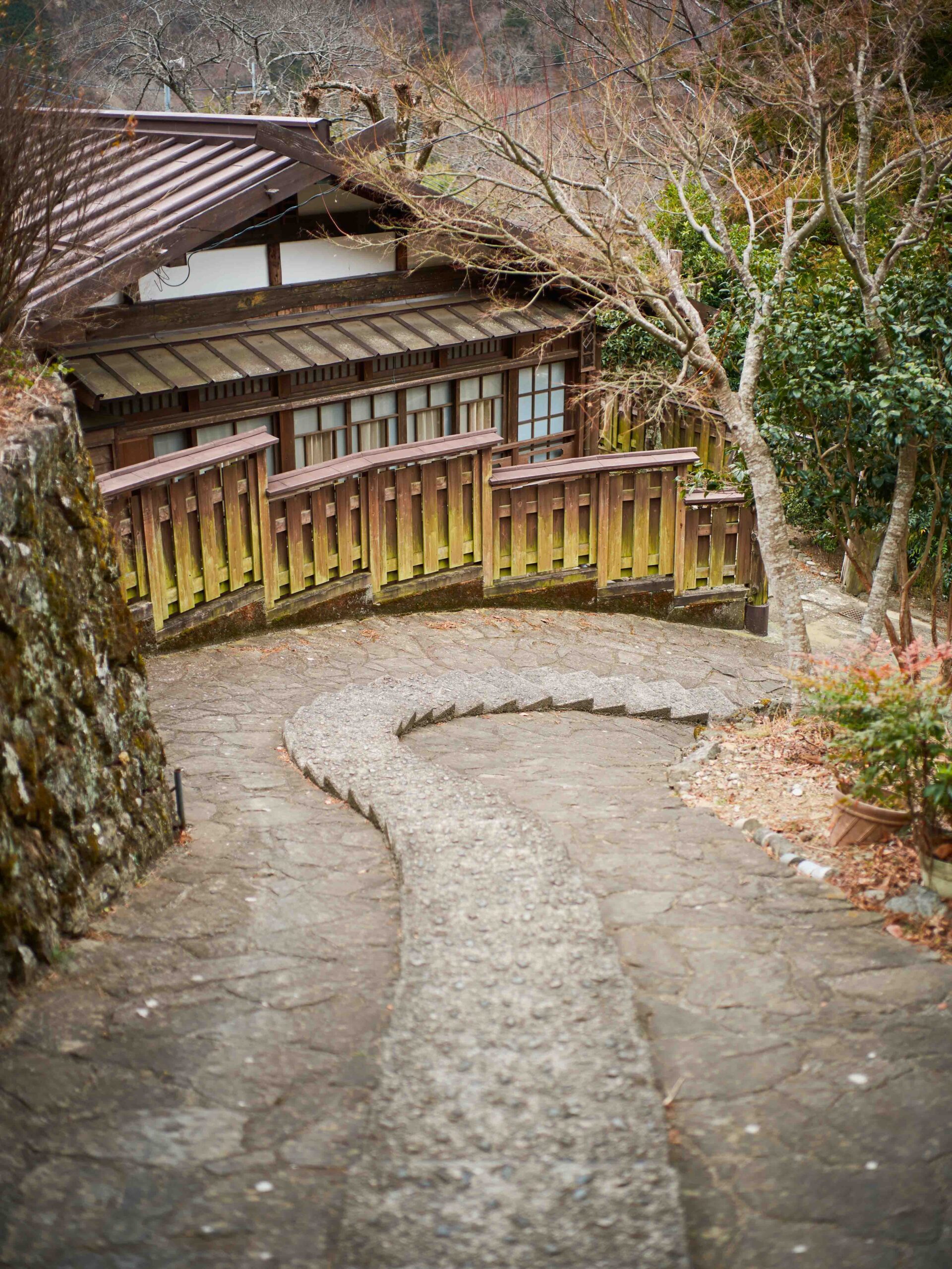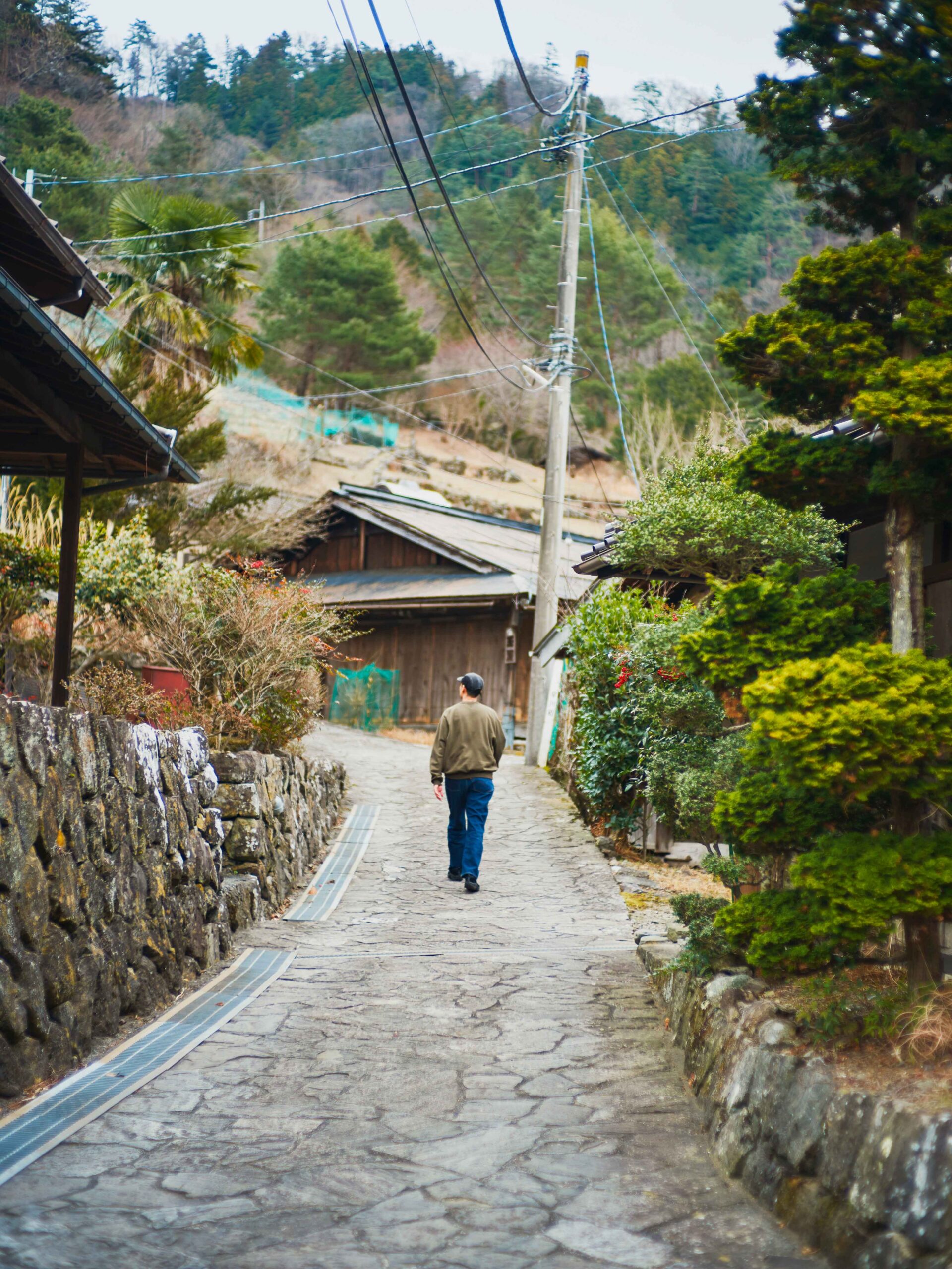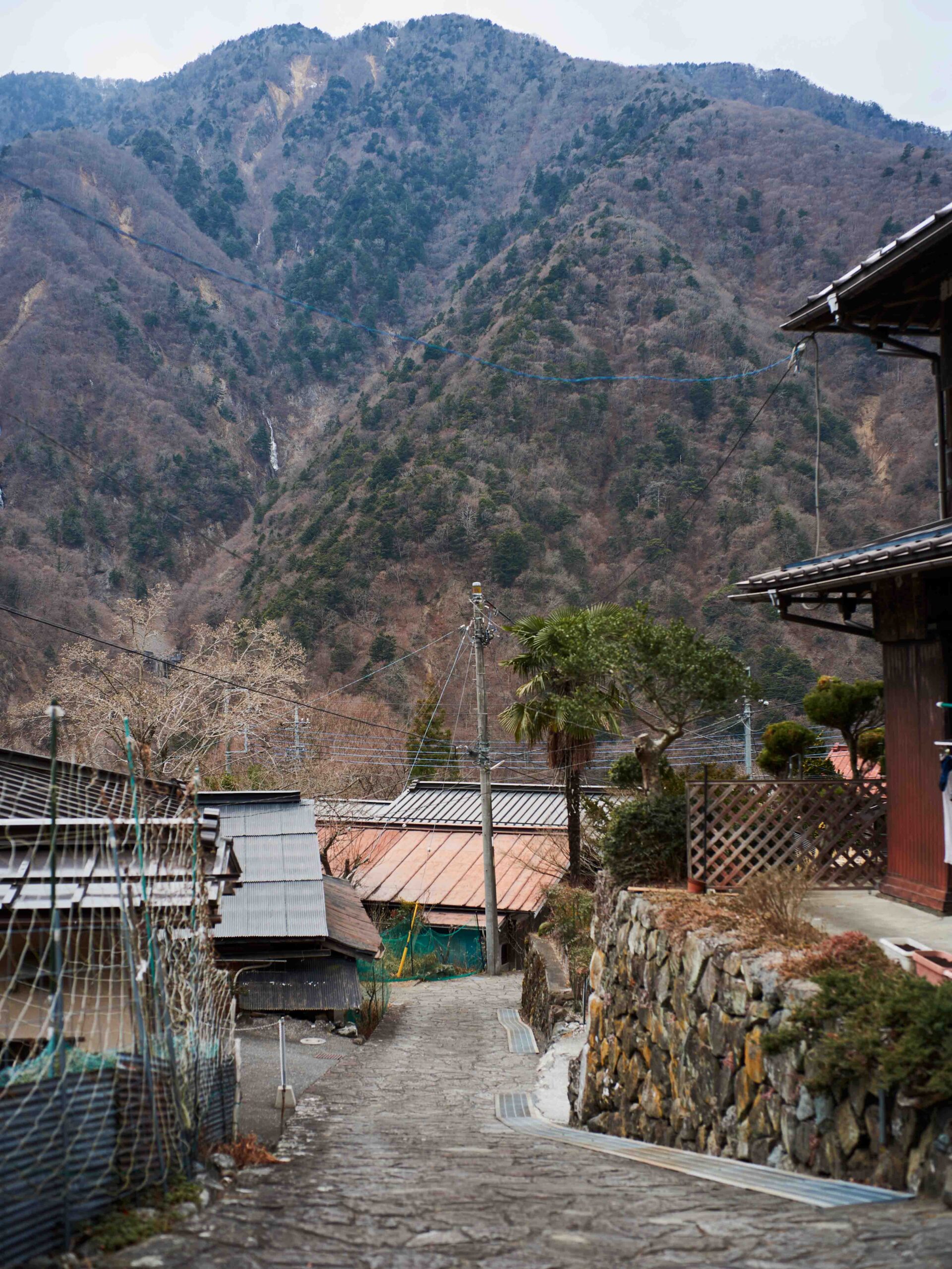 山道の道なりに連なって見える建物の屋根が印象的だ。