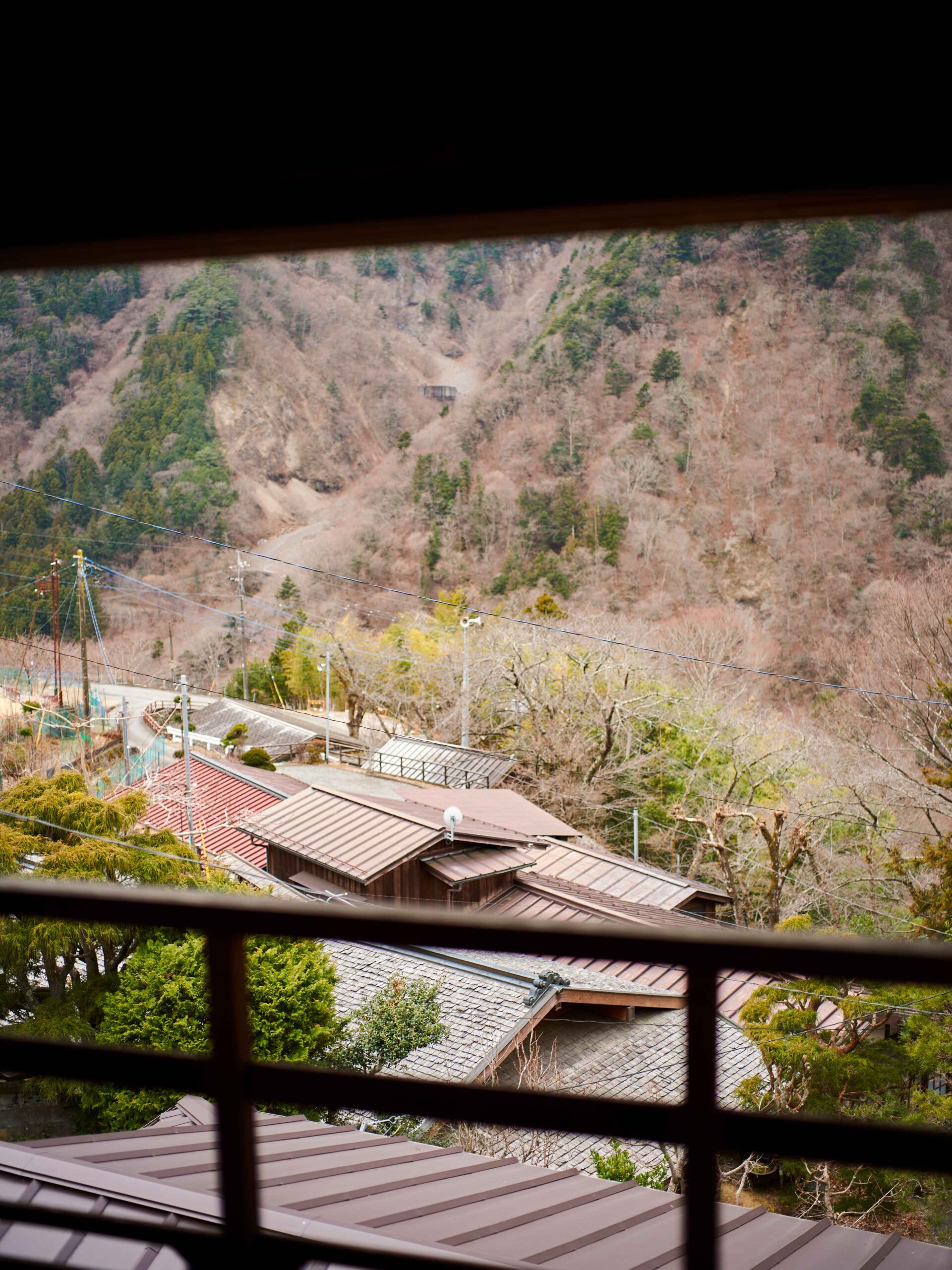 無料休憩所「喜久屋」の2階から七面山を望む。ガラス窓のない昔のままのつくりを堪能できる。