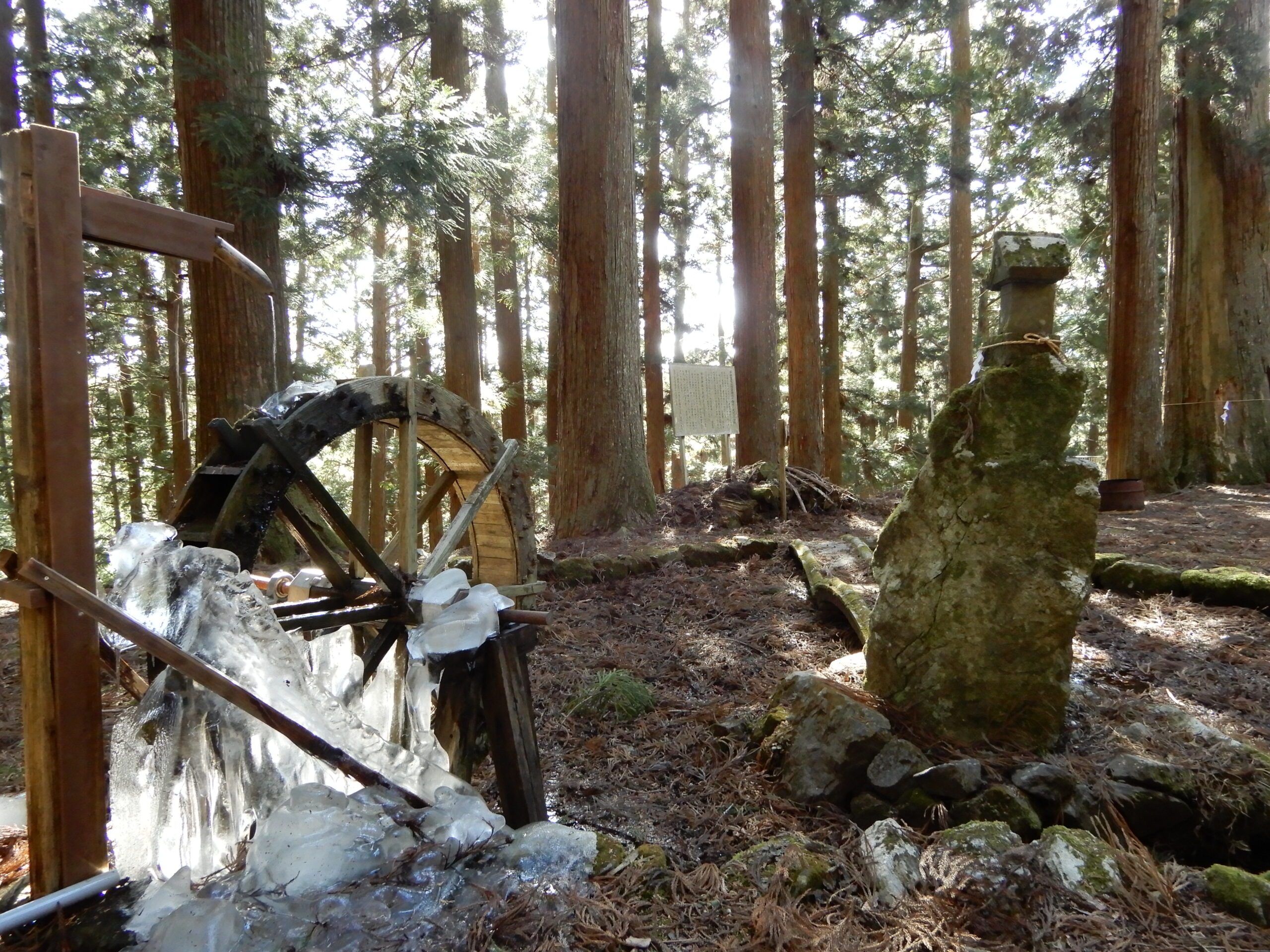 春のような陽気の日でしたが、水車の水は凍っていてキラキラと輝いていました。