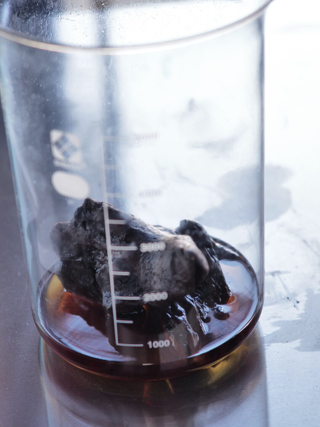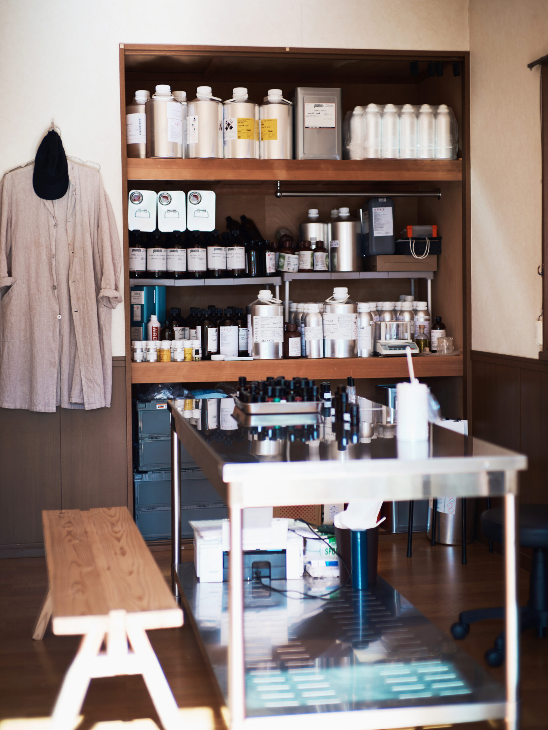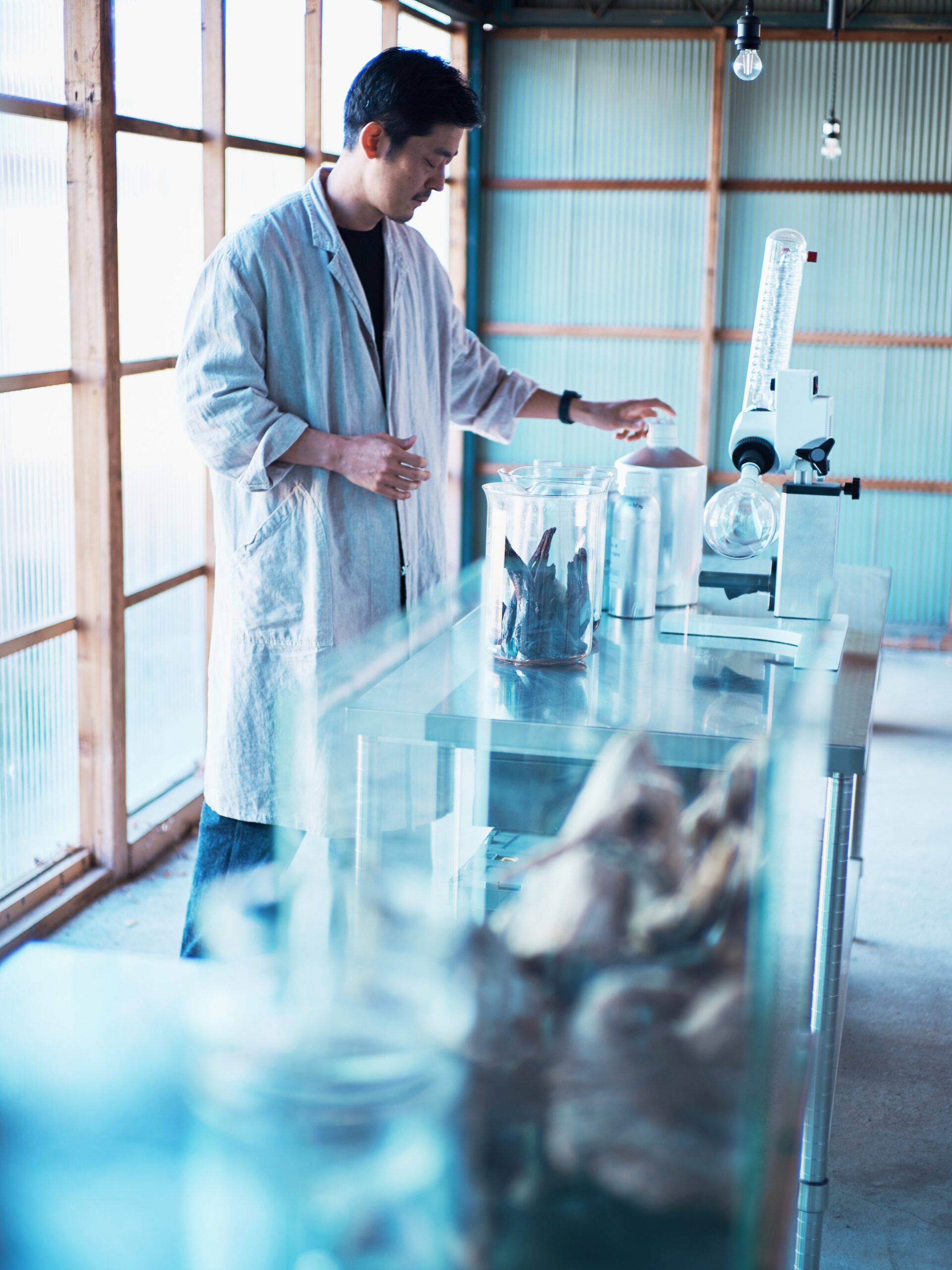 「これは、九州のヒノキのチップを蒸留して香りをとっているところです。こっちは、長野のヒバ。青森のヒバが有名ですが、長野のヒバのほうが少しクセがある香りになります。これは地元のワイナリーからもらったワインの搾りかす。フランスだと香料として一般的です、香水の隠し味的に使われているのですが、日本だとどこにもないのでつくりたいなと思って実験しています」