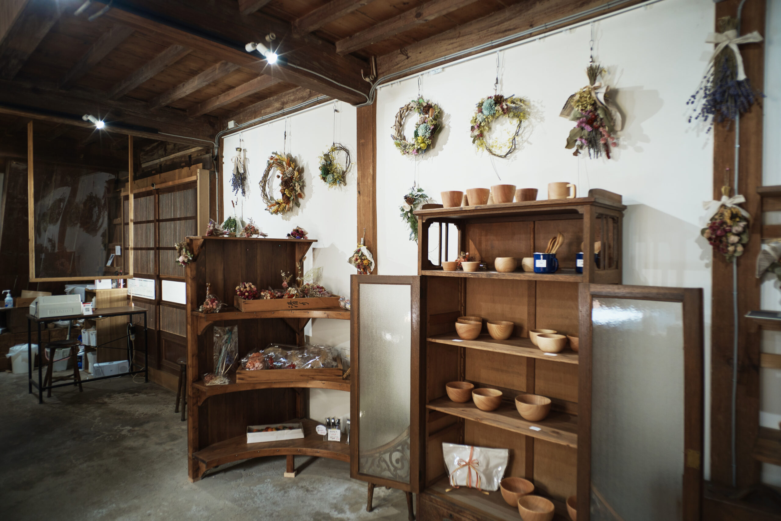 ギャラリーには、アトリエ近くの畑で自分たちで育てた花を使って芽衣子さんが作ったドライフラワーやリースなども並んでいる。「お花というのは、癒しや元気をもらえる存在なんです」。奥さまのその言葉どおり、木のナチュラルで優しい色合いに、花の色彩と香りが加わることで、アトリエ全体の印象が華やかで生き生きとした雰囲気になっている。
