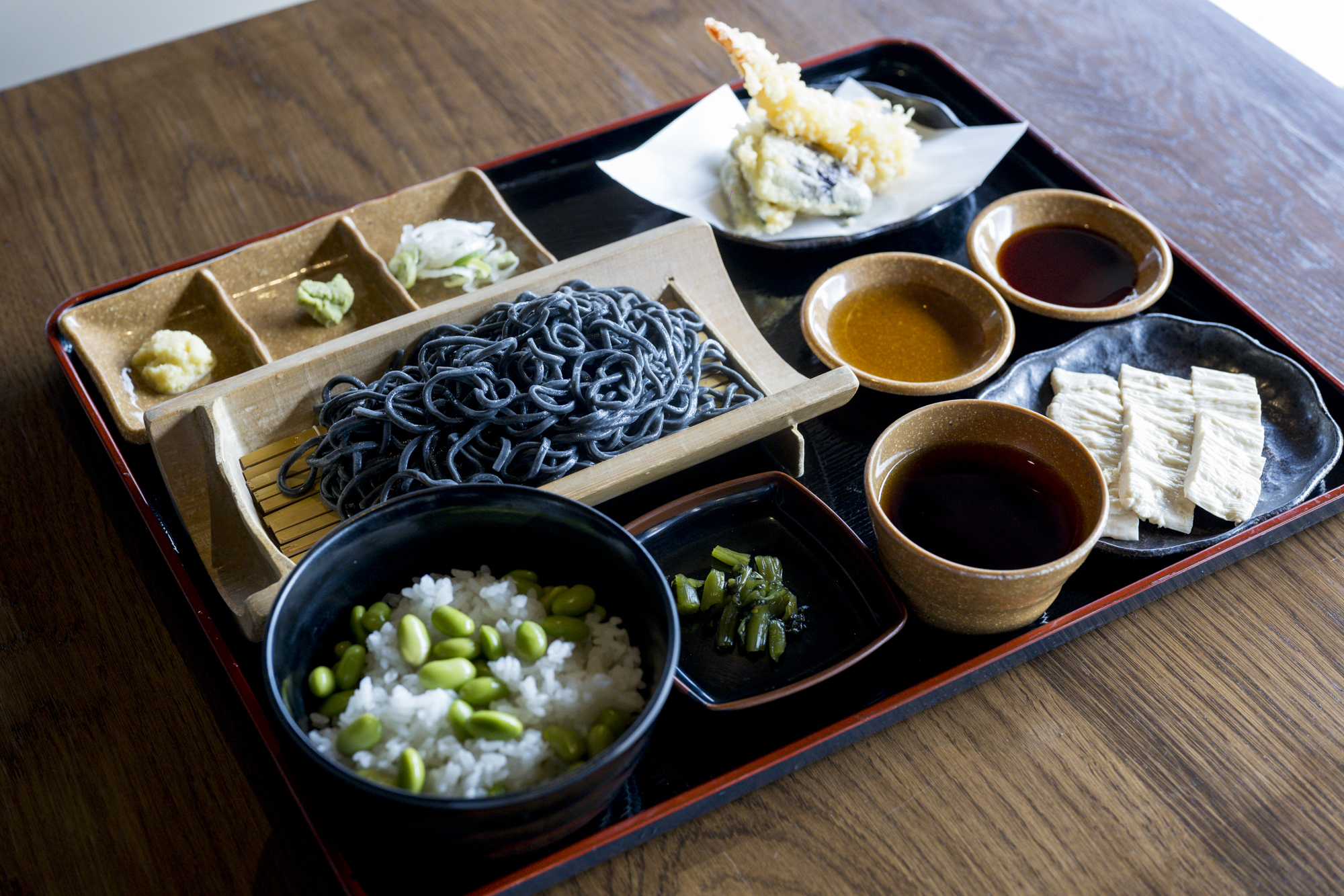 身延の食の魅力がぎゅっと詰まった、竹炭蕎麦とゆば刺身の定食。