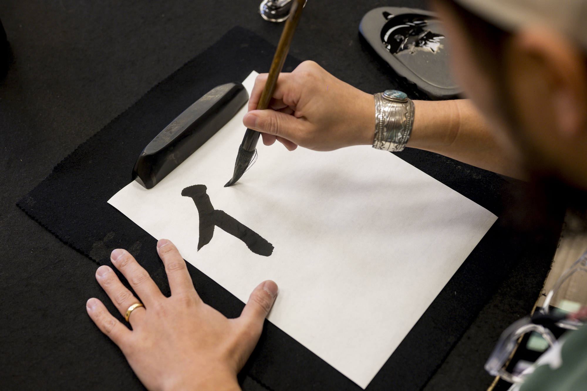 「かみすき館」では書道体験もできる。西嶋の書道用紙の書き心地を確かめてみて。