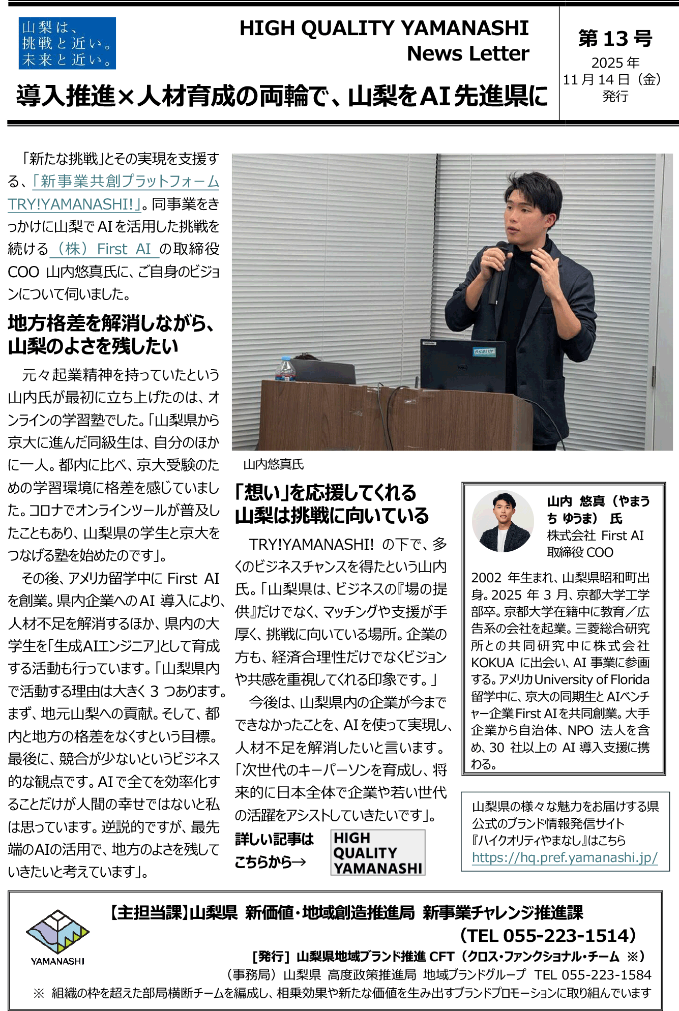 ハイクオリティやまなしニューズレターアーカイブ ニューズレターアーカイブ Vol.13 ニューズレターアーカイブ Vol.12 ニューズレターアーカイブ Vol.11 ニューズレターアーカイブ Vol.10 ニューズレターアーカイブ Vol.9 ニューズレターアーカイブ Vol.8 ニューズレターアーカイブ Vol.7 ニューズレターアーカイブ Vol.6 ニューズレターアーカイブ Vol.5 ニューズレターアーカイブ Vol.4 ニューズレターアーカイブ Vol.3 ニューズレターアーカイブ Vol.2 ニューズレターアーカイブ Vol.1 ニューズレターアーカイブ Vol.13 ※画像をクリックいただくとPDFファイルにてご覧いただけます アーカイブトップに戻る ハイクオリティやまなしニューズレターアーカイブ ニューズレターアーカイブ Vol.13 ニューズレターアーカイブ Vol.12 ニューズレターアーカイブ Vol.11 ニューズレターアーカイブ Vol.10 ニューズレターアーカイブ Vol.9 ニューズレターアーカイブ Vol.8 ニューズレターアーカイブ Vol.7 ニューズレターアーカイブ Vol.6 ニューズレターアーカイブ Vol.5 ニューズレターアーカイブ Vol.4 ニューズレターアーカイブ Vol.3 ニューズレターアーカイブ Vol.2 ニューズレターアーカイブ Vol.1 Topへ戻る 人気の記事RANKING 2023.03.10 #観光・食・体験 山梨で富士山を見るならここ!富士五湖周辺の絶景スポット20選 2023.04.17 #子育て 子育てにかかる費用はいくら?0歳から大学卒業までの総額を徹底解説!私立・公立の費用の違いや、やまなし独自の助成制度も紹介 2023.07.21 #地場産業 山梨県の郷土伝統工芸品「甲州花火」。受け継がれてきた技法や花火玉に込められた想いとは 2023.02.22 #日本酒 270年続く酒蔵の創業家で初の醸造家 山梨銘醸・北原亮庫さん 「山梨だからこそ」を大切に、日本酒を通じて表現 2025.11.06 #おいしい未来へやまなし 「無印良品 銀座」に山梨県産のエシカルなシャインマスカットが登場! おすすめの記事PICK UP 2025.11.06 #おいしい未来へやまなし 「無印良品 銀座」に山梨県産のエシカルなシャインマスカットが登場! 2025.10.16 #おいしい未来へやまなし 3日間で7万人が来場!大阪・関西万博で魅せた「ハイクオリティやまなしフェス」をレポート 2025.08.20 #おいしい未来へやまなし 洋菓子の名門アンリ・シャルパンティエが見出した山梨の桃、「夢みずき」の魅力。 2025.04.02 #おいしい未来へやまなし 「樹上完熟」のフルーツが主役。産地でしか味わえない、山梨の隠れた名品が生み出す“絶品スイーツ”の世界