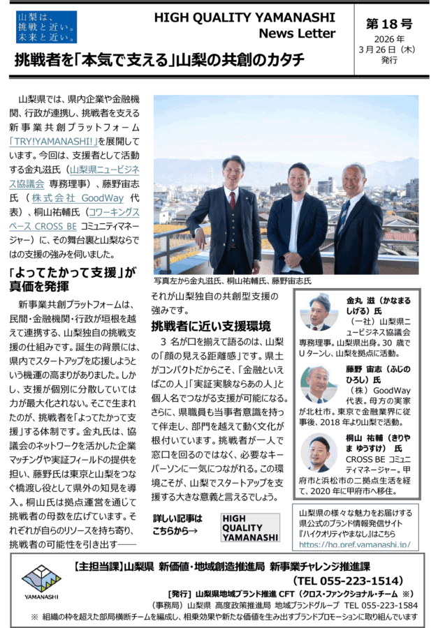 ハイクオリティやまなしニューズレターアーカイブ ニューズレターアーカイブ Vol.18 ニューズレターアーカイブ Vol.17 ニューズレターアーカイブ Vol.16 ニューズレターアーカイブ Vol.15 ニューズレターアーカイブ Vol.14 ニューズレターアーカイブ Vol.13 ニューズレターアーカイブ Vol.12 ニューズレターアーカイブ Vol.11 ニューズレターアーカイブ Vol.10 ニューズレターアーカイブ Vol.9 ニューズレターアーカイブ Vol.8 ニューズレターアーカイブ Vol.7 ニューズレターアーカイブ Vol.6 ニューズレターアーカイブ Vol.5 ニューズレターアーカイブ Vol.4 ニューズレターアーカイブ Vol.3 ニューズレターアーカイブ Vol.2 ニューズレターアーカイブ Vol.1 ニューズレターアーカイブ Vol.18 ※画像をクリックいただくとPDFファイルにてご覧いただけます アーカイブトップに戻る ハイクオリティやまなしニューズレターアーカイブ ニューズレターアーカイブ Vol.18 ニューズレターアーカイブ Vol.17 ニューズレターアーカイブ Vol.16 ニューズレターアーカイブ Vol.15 ニューズレターアーカイブ Vol.14 ニューズレターアーカイブ Vol.13 ニューズレターアーカイブ Vol.12 ニューズレターアーカイブ Vol.11 ニューズレターアーカイブ Vol.10 ニューズレターアーカイブ Vol.9 ニューズレターアーカイブ Vol.8 ニューズレターアーカイブ Vol.7 ニューズレターアーカイブ Vol.6 ニューズレターアーカイブ Vol.5 ニューズレターアーカイブ Vol.4 ニューズレターアーカイブ Vol.3 ニューズレターアーカイブ Vol.2 ニューズレターアーカイブ Vol.1 Topへ戻る 人気の記事RANKING 2023.03.10 #観光・食・体験 山梨で富士山を見るならここ!富士五湖周辺の絶景スポット20選 2026.03.19 #観光・食・体験 7年連続ミシュラン三つ星の料理人が、山梨で新たな店を構えた理由とは? 2026.03.03 #やまなしイノベーションストーリー 民間のキーマンが語る、山梨での新たな挑戦を支える仕組みとその舞台裏 2023.04.17 #子育て 子育てにかかる費用はいくら?0歳から大学卒業までの総額を徹底解説!私立・公立の費用の違いや、やまなし独自の助成制度も紹介 2026.02.27 #やまなしイノベーションストーリー 嫌な生理から自分を知る生理へ【株式会社asai|浅井しなのさん】 おすすめの記事PICK UP 2026.03.25 #地場産業 ジュエリー産地山梨でものづくり体験!オープンファクトリーの魅力に迫る 2026.03.24 #やまなしイノベーションストーリー 数値・カルチャー・ストーリーで読み解く、山梨が「挑戦に近い」と呼ばれる理由 2026.03.19 #観光・食・体験 7年連続ミシュラン三つ星の料理人が、山梨で新たな店を構えた理由とは? 2026.03.17 #やまなしイノベーションストーリー 「歩きづらい」 その違和感が社会を変える。山梨で加速した登山道DXの挑戦【小田急電鉄株式会社|板谷拓人さん】